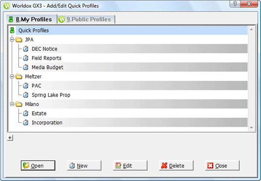 Highlight (select) any quick profile listed on either tab, then click one of the buttons at the bottom of the dialog: