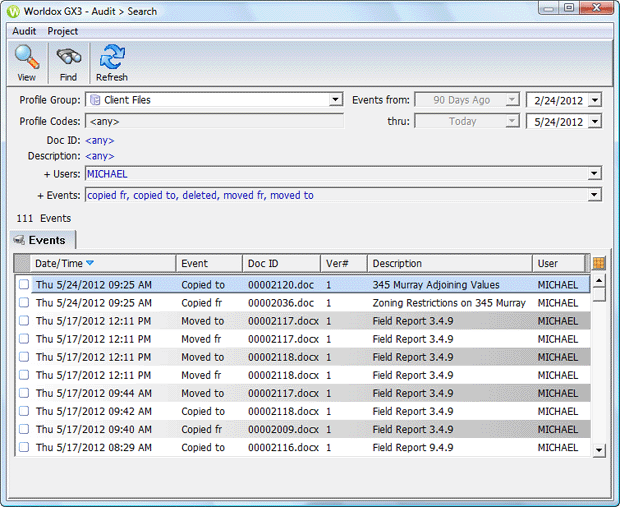 TIP: Titled Audit > Search, this dialog opens to display results from audit queries. This same dialog - called Audit > File - is used to display audit history for a single file. |