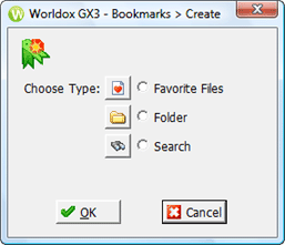 • Choose Favorite Files to bookmark a Favorite Files category. That opens the New Bookmark: Favorite Files dialog. • Choose Folder to bookmark a worklist of files in a specific folder location. An example would be all documents relating to one matter for a specific client. • Choose Search to bookmark a saved search, as a shortcut for quickly re-running that search. That opens the New Bookmark: Search dialog. |