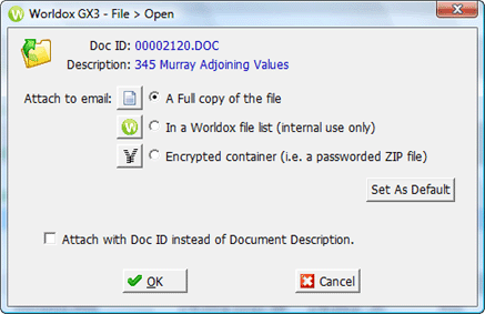 If you want the options selected here to be pre-selected the next time you see this dialog, click Set As Default. That opens the Set as Default dialog, where you can tell Worldox to make this your default choice.