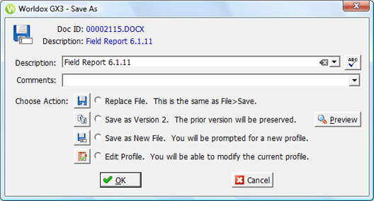 • Choose Replace File to save changes to the existing file or version. • Choose Save as Version ... to save the changed document as a new version. • Choose Save as New File to create a new file, which will have to be profiled before it saves. • Choose Edit Profile to modify the current profile for this existing document or document version. |