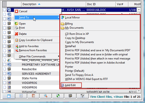Worldox provides a Send To submenu (available via right-clicking on work list files) with short-cuts to various applications and functions. Until now, you could add, edit and delete Send To targets, but could not change how those choices were presented on menus. This GX2 enhancement allows you to do exactly that, and even gives you a way to place Send To targets on the top-of-screen Worldox pull-down menu bar.