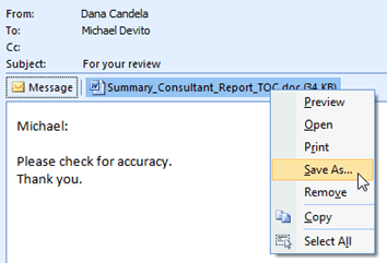 In the message window, highlight or select the attachment and save. In Outlook, that means right-clicking on the attachment and selecting Save As: