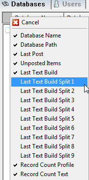 Date of last text build – for each applicable split folder. The can be up to 9 such splits at very large databases. Note: These columns are not displayed by default. If your database(s) are split, please insert the appropriate columns here. To insert a column, right-click on the grey, blank space in the column header bar, then select one of the listed choices.