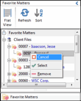 The Favorite Matters feature displays a list of matters you have accessed recently. This is similar to the Worldox Favorite Files feature except that folders are being tracked here rather than individual files. In fact your Favorite Matters list is derived from your recently accessed Favorite Files.