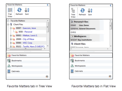 In previous versions of Worldox, the Favorite Matters tab in the Navigation Panel showed Worldox, Profile Group name, Active folder with sub-folders.