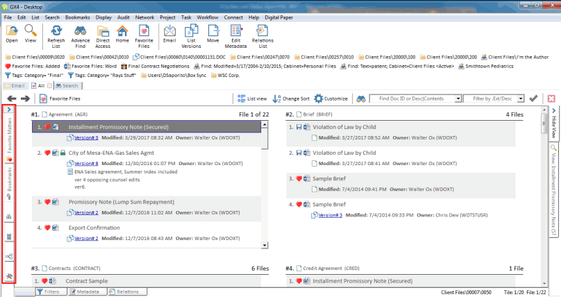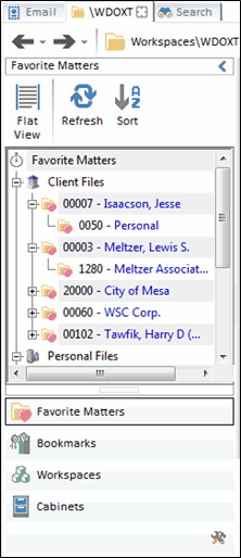 The Navigation Panel’s buttons (Favorite Matters, Cabinets, My Computer, Workspaces, Workflows and Bookmarks) are collapsed into tabs on the left side of the screen.