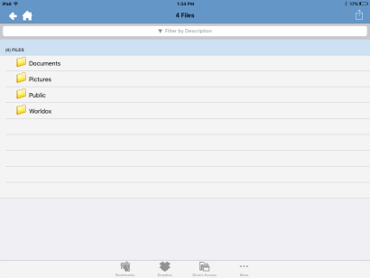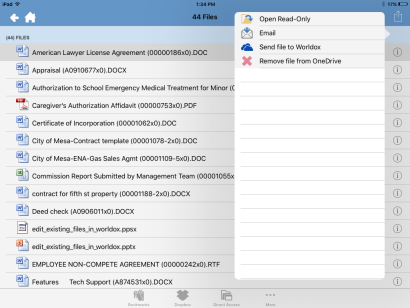 The Worldox for iPad app is integrated with Microsoft OneDrive, an online file backup and synchronization tool that is available on the web and as an iPad app. You can easily access any files or images you have stored in OneDrive directly from Worldox for iPad.