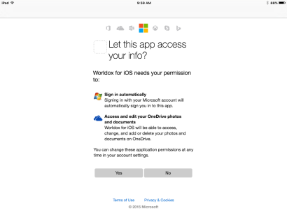 A screen may ask you to confirm that the Worldox for iPad app is allowed to access your files on OneDrive. Select Yes.