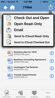 Check Out and Open to open the file and to check it out of Worldox. If you select this, you will see a list of applications on your iPadiPhone which can open or accept documents. For example, if you want to open a PDF, you may see an Open in Dropbox option. Log in to Dropbox to view the PDF.